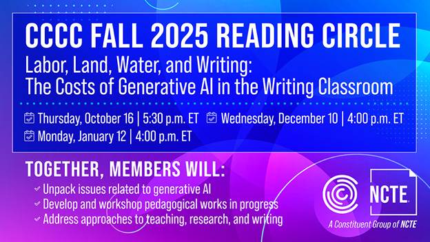 Join CCCC for a critical, nuanced, and thoughtful exploration of generative AI, its costs, and its effects on college writing instruction and writing research. This three-part Reading Circle will be a collaborative space to exchange knowledge and pedagogical practices.